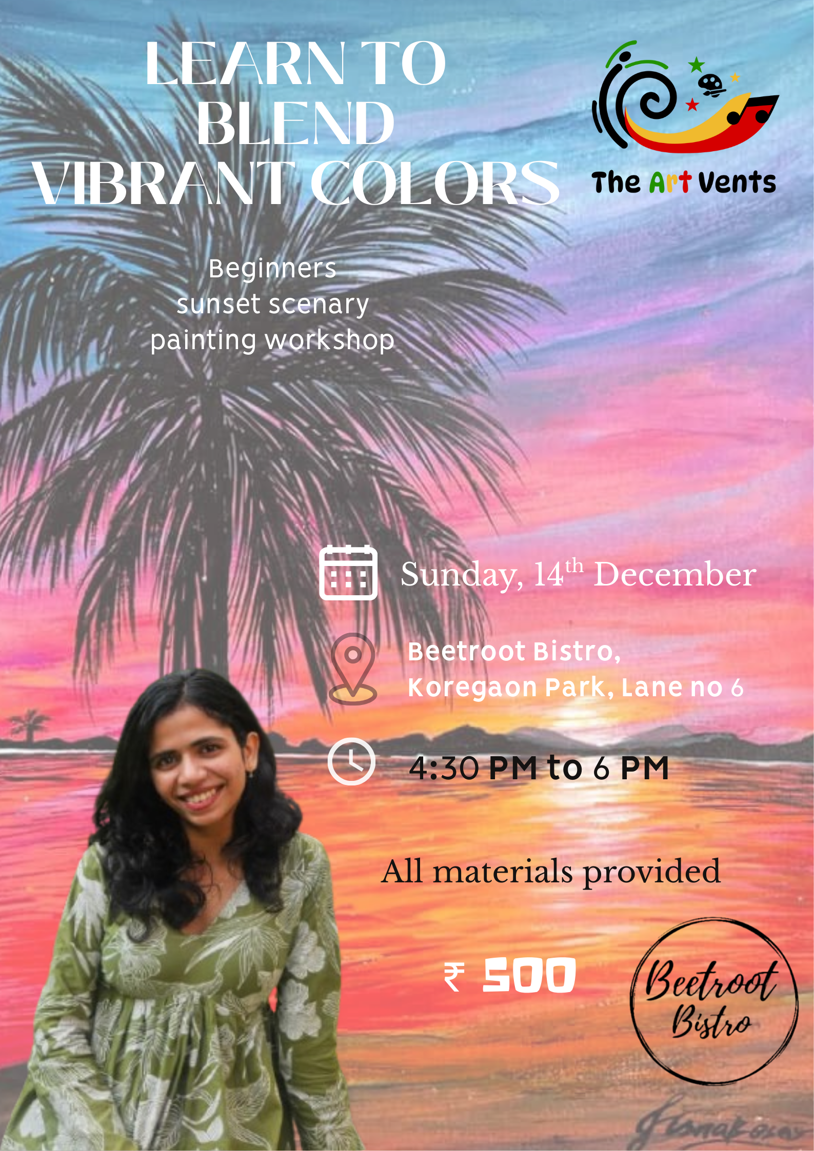 Learn to blend vibrant colors and create a stunning acrylic sunset scenary painting. This workshop is perfect for beginners and art enthusiasts looking to explore their creative side.