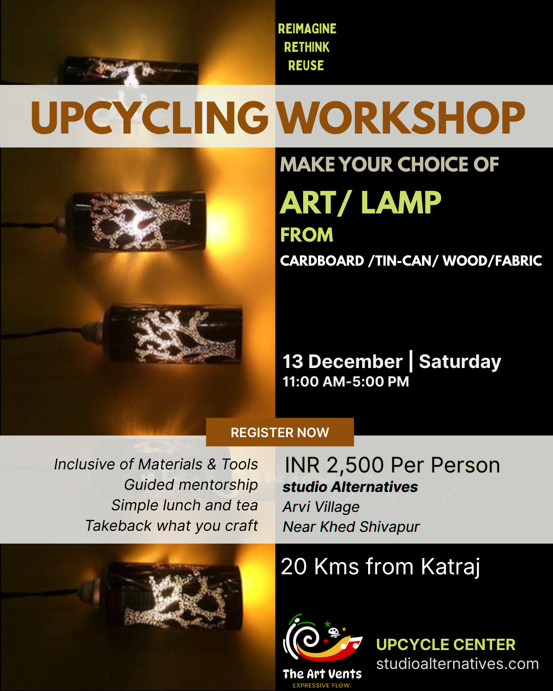 MAKE YOUR OWN CHOICE OF LAMP or ART from Cardboard/ Tin-Cans/ Wood/ Fabrics with guided mentoring from upcycling experts.